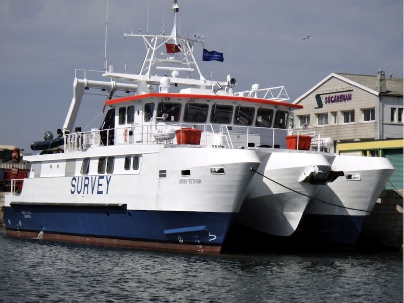 The surveys were carried out along a total of 14 proposed cable routes for both existing and proposed wind farms, and a single proposed platform location. The firm’s newly completed specialist semi-SWATH catamaran Bibby Tethra took the lead on the project, supported by geotechnical engineers from Chester-based Geotechnics Ltd, aboard MV Poseidon.