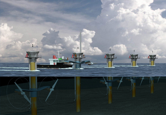 Marine current turbines generate electricity by utilizing tidal current flows. The SeaGen turbine is fixed on a structure and is driven by the flow of the tides with a key advantage that the generated power is precisely predictable in the tidal cycle. This technology effectively is similar to that of a wind turbine with the rotor blades driven not by wind power but by tidal currents. Water has an energy density of more than 800 times that of wind. Twin rotors rotate with the movement of the tidal flow and pitch through 180 degrees to optimally track tidal current direction and speed.