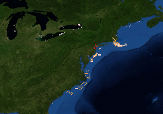 The 1st edition was launched at the AWEA offshore wind conference in Baltimore, USA in October 2011. This map shows all areas in the USA and Canada including the Great Lakes where wind farming is proposed and planned. Offshore wind farm areas are colour coded to show the stage that area is at together with the developer, and generating capacity where known. This includes request for interest areas, areas under application, areas granted and fully consented areas. Insets appear for the busy areas on the east coast and the Great lakes
