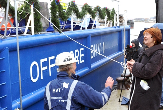 On December 16, 2011, Bremen Mayor and Senator of Finance, Karoline Linnert in front of 250 guests at BLG-car terminal christened OFFSHORE BHV 1 pontoon.