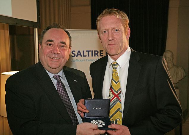 First Minister Alex Salmond presented Dr Yemm, now Commercial Director of Pelamis, with the second annual Saltire Prize Medal at the Scottish Renewables annual conference dinner in Edinburgh.