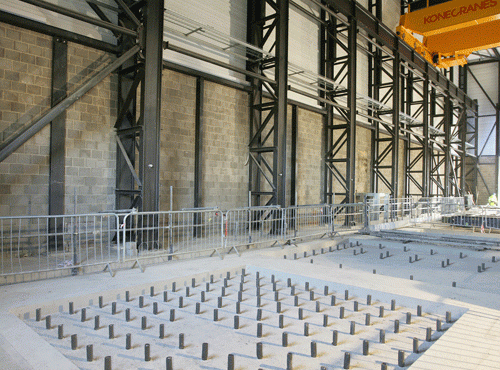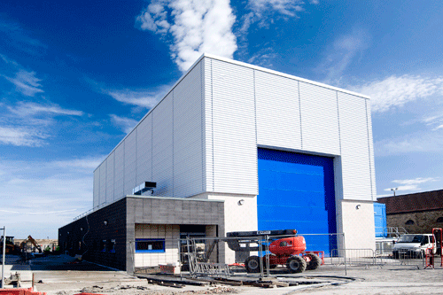 The steel structure of the test hall is 15M high and is constructed over an existing dry dock. The dry dock needed three mass concrete pours to cover an area of 45x15x6.5m (approximately 7000m3) and is reinforced with large grade steel to withstand the weight of the frame and rigorous testing procedures.