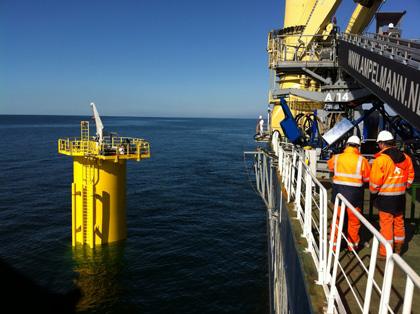 On arrival at Aalborg, the vessel Jumbo Javelin started loading transition pieces at Bladt Industries on 13 April 2012, and already on 16 April the first transition piece was placed on the monopile in the wind farm.