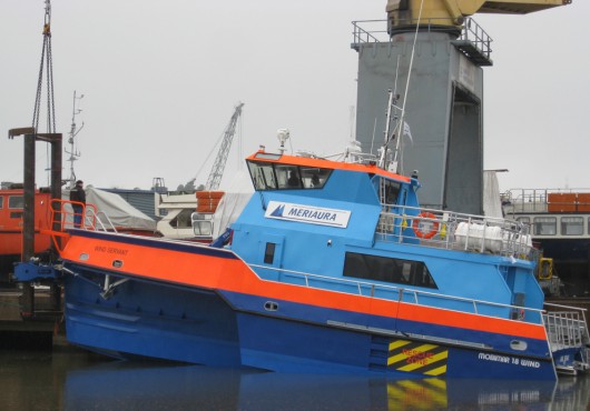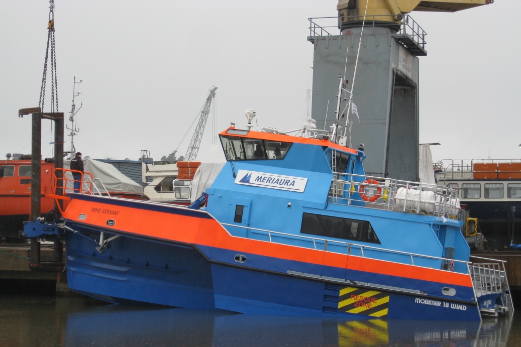 Transfer /windfarm service vessel Mobimar 18 Wind, after it was launched on February 27th, has passed all the conventional sea trials and in addition extra tests from towing 20m by 50m barge to hanging from a crane test. Mobimar 18 Wind was designed and built by Mobimar Ltd. in Turku, Finland and classed by Bureau Veritas, DNV or equivalent.
