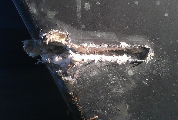 The damage seen in the first photo resulted from a collision at speed with a steel edged concrete structure displacing its timber rubbing strake through the force of impact. This created a 10mm by 100mm gash to the forward port hull above the waterline, putting the vessel out of commission.