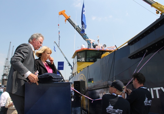 Visitors could see the christening of the Damen High Speed Support Vessel 2610, Marineco Dignity, on the second day of the Seawork International 2012 exhibition in Southampton. The ceremony was performed by Pauline Millar, the godmother of the vessel.