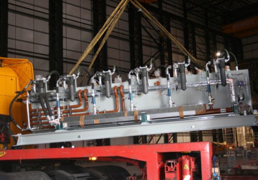 The power unit, comprising six Moog RKP Radial Piston Pumps, has an installed power of 675 kW, delivering a flow of 1,200 lpm (317 gpm US) at a pressure of 280 bar (4061 psi). A dedicated PLC controls and monitors the performance and health of the unit and a water cooling system maintains the temperature of the hydraulic fluid. High pressure hydraulic fluid is circulated around the facility by a custom designed distribution network.