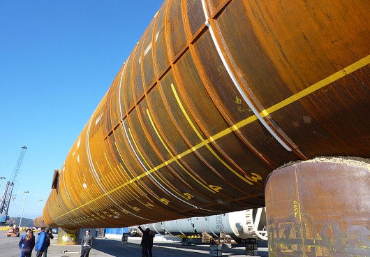 Transportation and ramming of the 30 monopiles is being carried out by “Oleg Strashnov,” a 183-foot crane ship. A total of ten times, the special ship will operate for the next two months between the construction site and the Dutch port of Vlissingen, where the foundation piles are provided. They were fabricated in Aviles Spain.