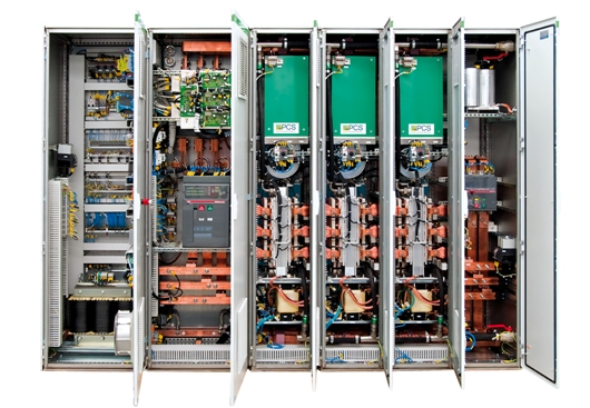 The PCS Green Line full power converters rely on liquid-cooled IGBT-based 4-quadrant converters. Each power module offers an output of up to 500 kW (620 kVA). The inductor-type parallel circuits make the converters scalable in 500 kW increments, which means they can be used flexibly. PCS is also currently developing an innovative integrated overall solution for converting wind energy to electricity.