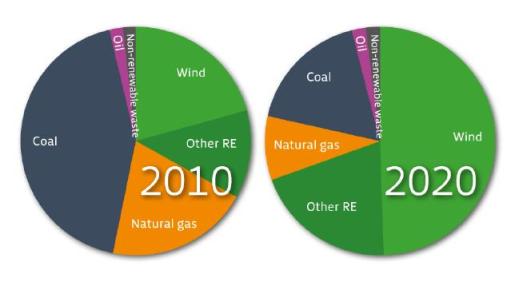 Electricity consumption by source of energy (adjusted for electricity trade) in 2010 and 2020; Source: Danish Energy Agency
