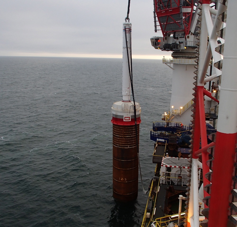 Upon completion of due tests in December 2012, the first batch of monopiles and transition pieces were loaded in Vlissingen, The Netherlands. For the offshore handling of these 700t,  6,5m diameter piles, a 1200MT crane is used, supported by a hydraulic upending system.  Accurate positioning and alignment is ensured through the gripper system outward the vessel side and the robust  DP-2 system on Seafox 5.