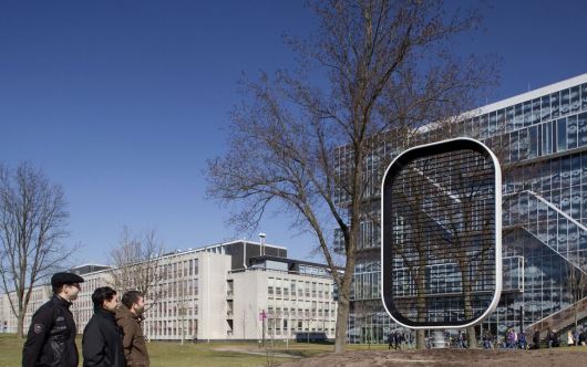 From Wednesday, March 27, a scale model of a bladeless windmill can be viewed in front of the faculty of Electrical Engineering, Mathematics and Computer Science at Delft University of Technology.