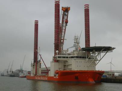 The Brave Tern, Fred. Olsen Windcarrier’s 132 metre long and 39 metres wide jack-up installation vessel, berthed alongside the Wagenborg quay in Eemshaven last week, 11th of April 2013.