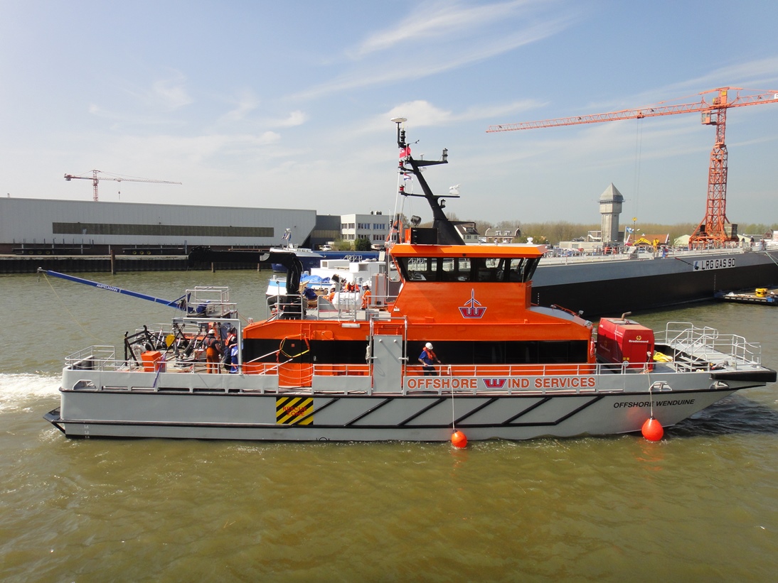 Offshore Wenduine (0W3) has been converted into a multi-purpose Catamaran Work Boat and been finalized end of April by shipyard Den Breejen under the supervision of Workships Contractors B.V. Her first job was to assist in the testing of the Amplemann L-type access system. Also, the manoeuvrability of the ship in the area of the landing point was successfully assessed.