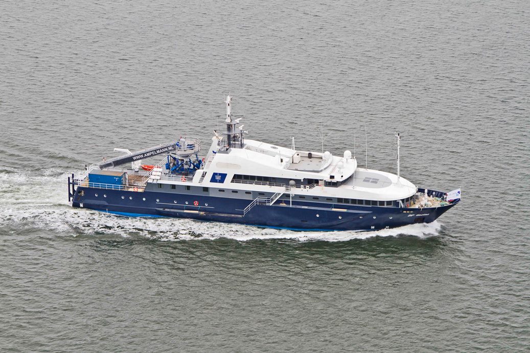 During the conversion the vessel was lengthened by 9 metres and sponsons were added to improve the sea keeping and make the vessel more confortable for those onboard. Internally the vessel was completely changed and is now capable of accommodating 60 to 90 persons, in its ‘state of the art’ accommodation facilities.