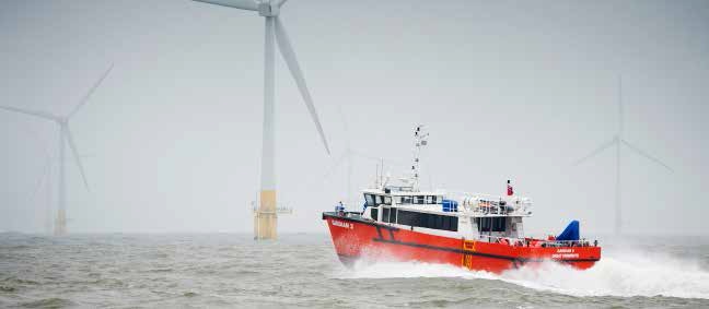 Another player in this class of larger support vessels is Windcat Workboats. Their 101 is capable of carrying 45 passengers at a top speed of 31kts and can not only carry the engineers out to an accommodation unit in the wind farm, but it can also stay out there for the daily transfers to the individual turbines. Since its launch and first operation in 2011 it has been able to prove to wind farm operators the advantages of its size of carrying much larger numbers of passengers and being more economical in certain circumstances. Windcat are working on plans for other larger vessels specifically for the wind farms further offshore.