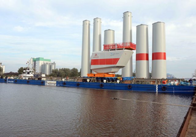 Using its special SPMT (Self Propelled Modular Transporter) vehicles, BLG subsequently transported the nacelles and their associated components from their storage locations at the company AREVA Wind to the Labradorhafen and arranged their loading onto the pontoon. The pontoon was then towed to the ABC-Halbinsel offshore terminal. There, the components will shortly be transferred onto the installation vessel THOR which takes the components to the construction site and installs them at sea.