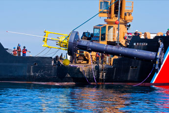 The acoustic sensor was tested by a support vessel running in regular and irregular modes, in both short radius and wide patterns. In addition, at least two land-based stations received HF radar signals from the APB-350. The PowerBuoy simultaneously provided power to the HF radar transmitter, the acoustic sensor and related electronics, the AIS receiver and the communications package, and also maintained power to all the buoy electronics (“hotel load”). After addressing these power loads, the excess power produced was stored in the APB-350 on-board energy storage system.