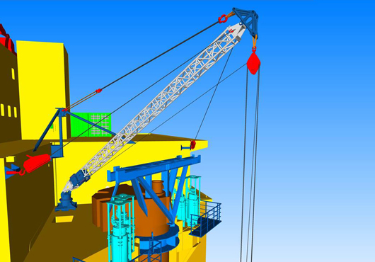 The foundations of the lift booms are welded directly onto the deck of the offshore substation and the booms are braced in two directions. The luffing pendant is welded to the 1st deck, right above the base of the lift booms.