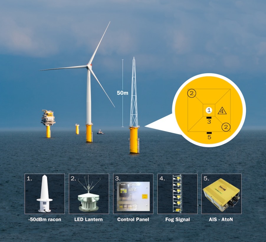 In addition to safe marking of offshore wind farms to protect against collisions and accidental damage caused by shipping, the consortium also supplies and installs a complete range of other low-voltage equipment, including power supplies, general lighting, aviation lights and winches.
