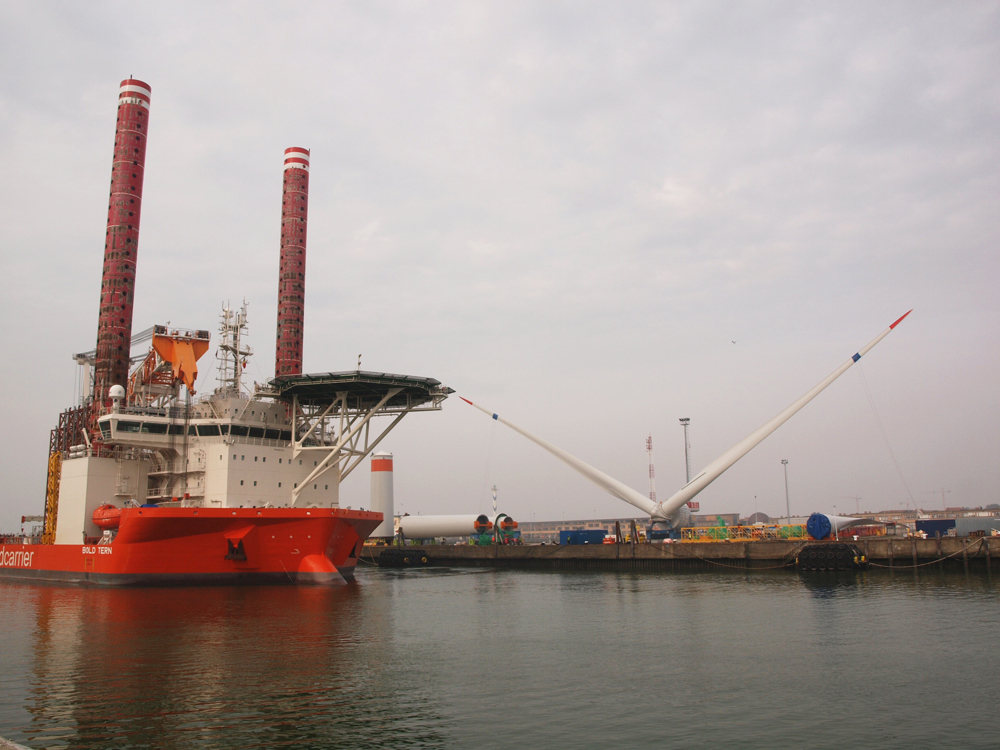 The various components of Alstom’s 6MW offshore wind turbine, currently one of the most powerful on the market, are in the process of being loaded onto the liftboat or self-elevating wind turbine installation and crane unit, “Bold Tern”, in the port of Ostend, Belgium.
