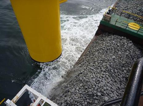 The scour protection consists of placing several layers of different sized stones around the monopile in order to prevent erosion of soil.