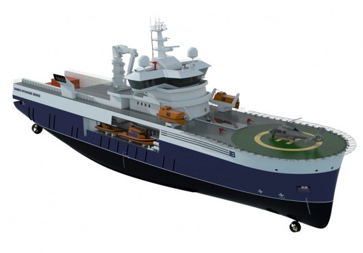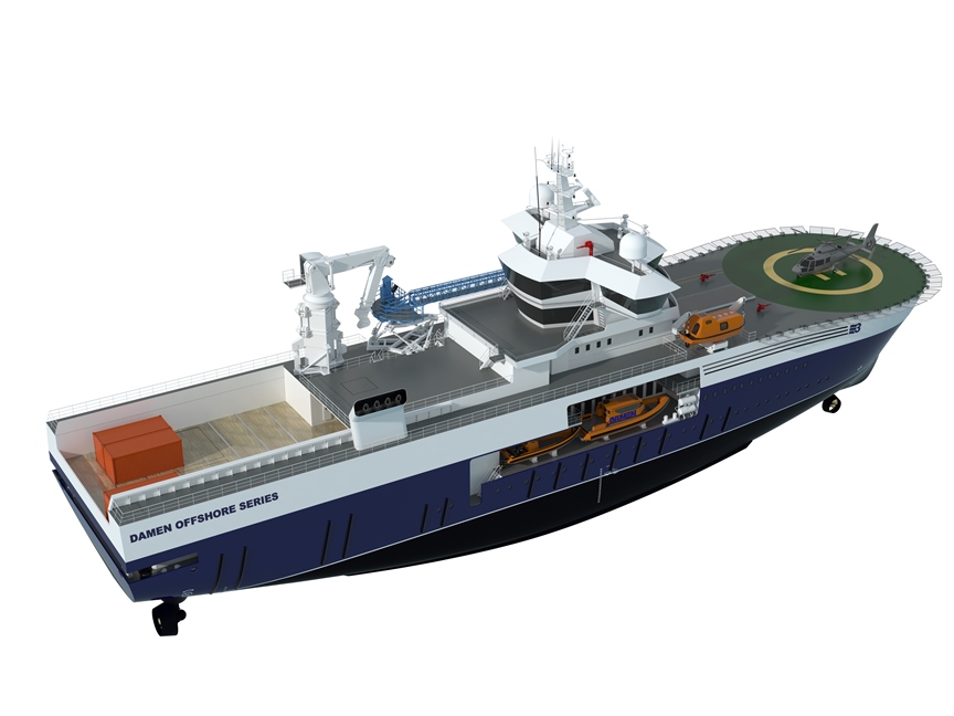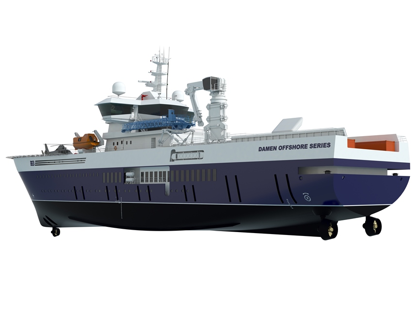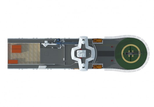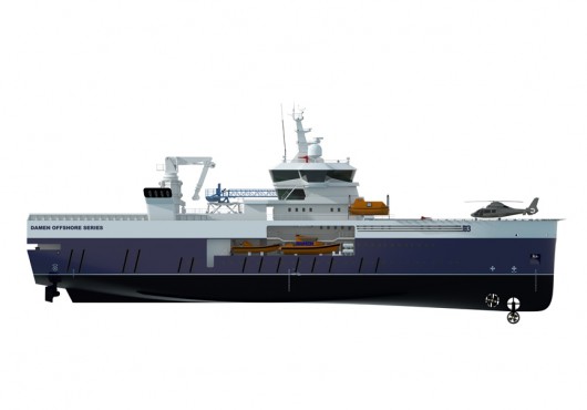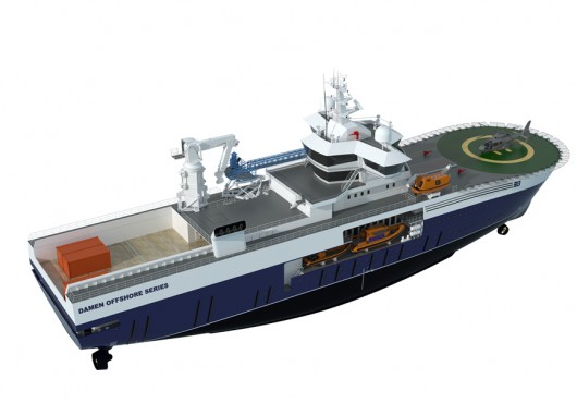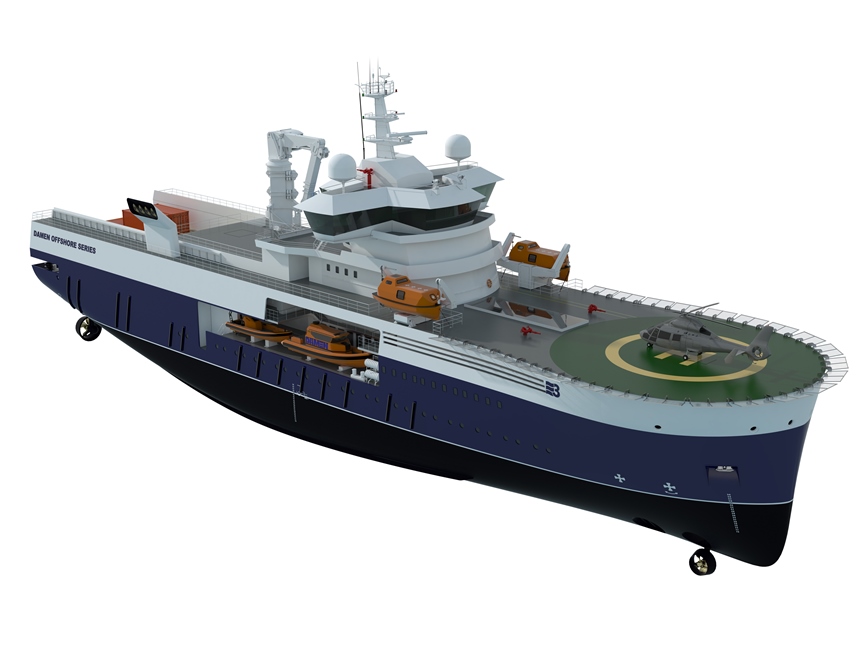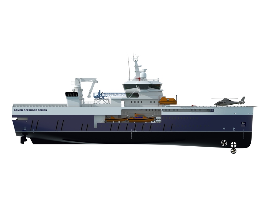 The result is a monohull vessel with bridge and accommodation located amidships. With a 90m length overall and a beam of 20m, the Damen WSV will feature 500m2 of deck space, a helideck and a motion and heave compensating crane. Its shallow 4.6m draft optimizes comfort, while also conferring significant power savings.