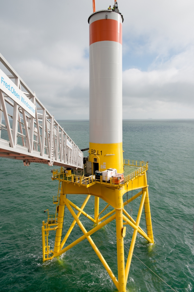 The 61-metre jacket has been set on top of pillars which have been sunk to a depth exceeding 60 metres. Then the 3 elements of the 78-metre tower were gradually assembled on the jacket. In all, the nacelle towers at a height of over 100 metres above sea level. The overall weight of the turbine and its structure totals 1,500 tonnes.