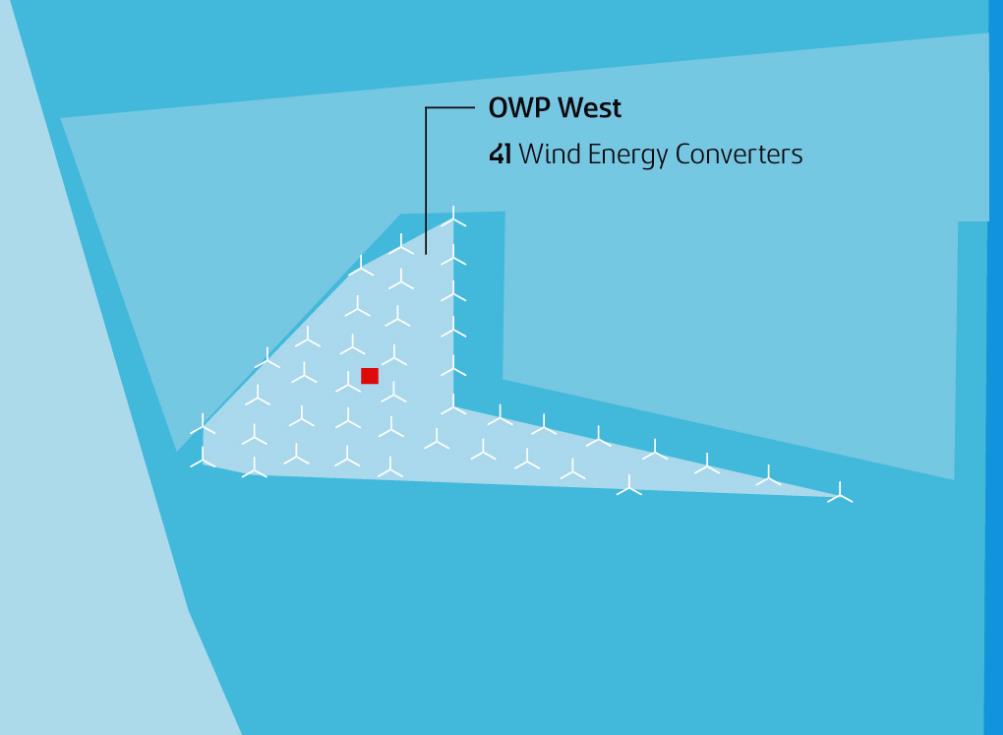 The OWP WEST is located 58 km offshore Borkum, in the south-eastern North Sea, inside Germany’s exclusive economic zone (EEZ), covering an area of 14.1 square kilometers.