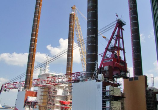 Afterwards, the land-based crane lowered and inserted the steel legs into the tube guides of the vessel. The raising and installation took two days per leg.