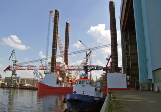 During the past eight days the four huge steel pipes, which were transported to the Wismar shipyard by sea from Cuxhaven, were vertically raised and installed one by one with the aid of a giant lattice boom crane supplied specially for this project. Assistance was provided by the floating crane ‘Enak’, which from the opposite base helped to guide the legs during the erection process.