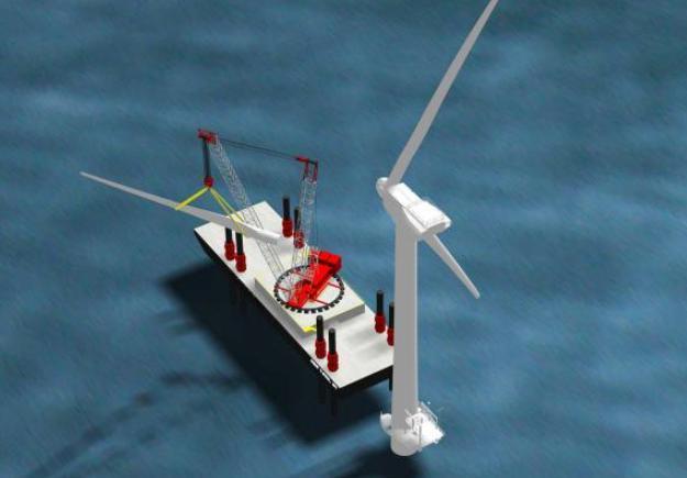 The R.D. MacDonald is a jack-up barge whose hull was launched in Jacksonville, Florida in 2012, and will be outfitted with a crane in Houma, Louisiana next year. The crane on the 260 foot long vessel will have a 280-foot boom allowing it to reach over 350 feet into the air when jacked-up offshore. The barge will be able to transport three wind turbines at one time and will have racks to carry the turbine blades.