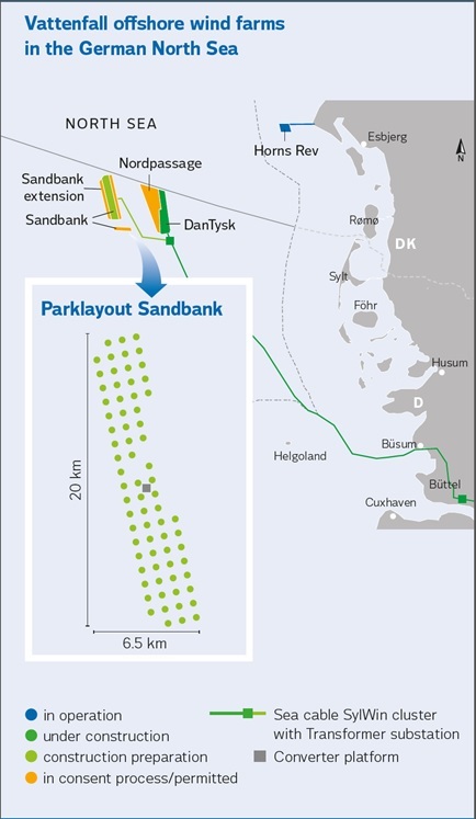 In August Vattenfall and Stadtwerke Miinchen (SWM) reached an investment agreement for the Sandbank offshore wind project, with an investment value of approximately €1,2bn, to be built 90km west of the island of Sylt. A special project company, Sandbank Offshore GmbH, is set up for this purpose whereby Vattenfall holds 51% and SWM 49% of the shares. Sandbank will have 72 turbines installed in an area covering around 21 km2, in water depths between 25 and 37m.