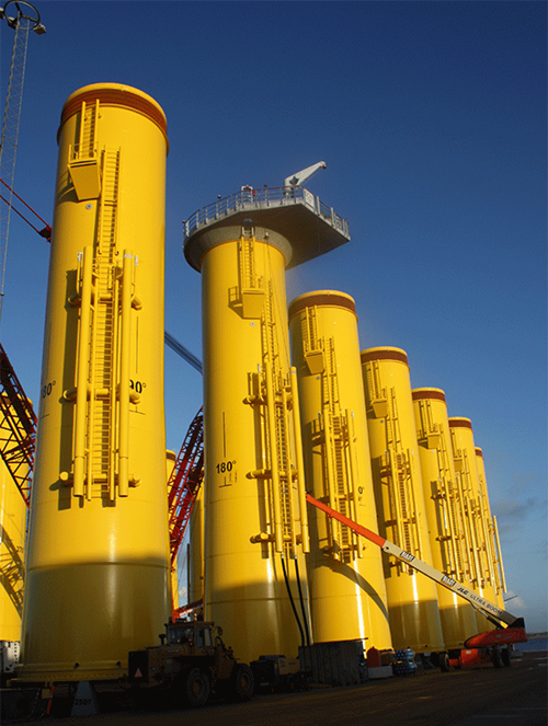 The transition pieces, with a diameter of six meters and a height of approximately 30 meters, will weigh well over 500 tonnes when completed.