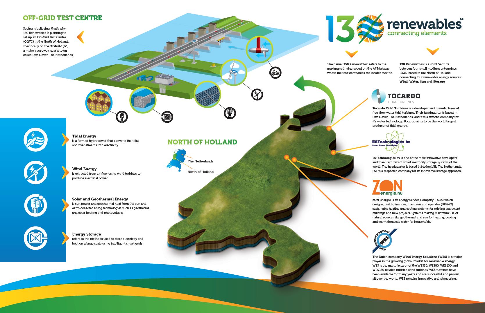 The partnership of 130 Renewables between Wind Energy Solutions, Tocardo Tidal Energy, Zon Energie and ESTechnologies develops a hybrid off-grid renewable energy system that delivers renewable energy to the local smart grid.
