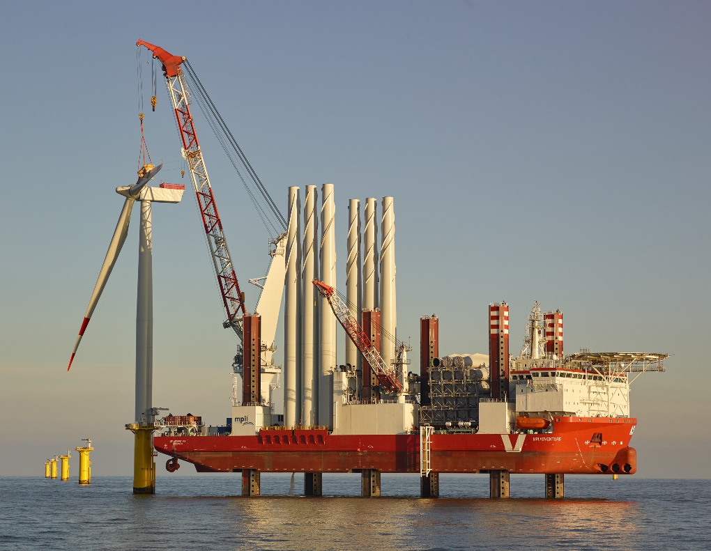 Image: E.ON (Installation of the first turbine at Amrumbank West.)