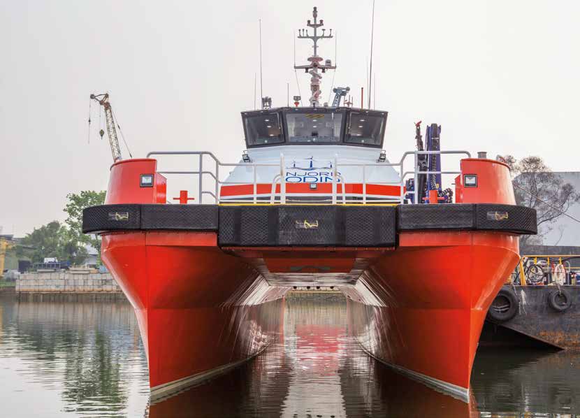 OW22_spread 19 2Vessels with a large and raised foredeck area with the high bow, the two deck topside, and narrow individual hull cross section are now features being included in vessels developed by other CTV designers and built by other boat builders for the offshore wind industry.
