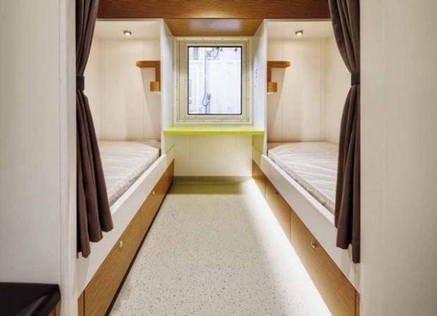 These 2-unit TLQ’s are relatively large measuring 10.2 by 3.3 by 3.3 metres providing comfort with ample space for 2 persons per unit. Rather than using bunk beds these units are designed with 2 low large sized single beds opposite each other. Each bed section has its own TV screen, USB adapter, adaptable light and plugin for earphones. The bathroom has a heated floor and swing doors for the shower instead of curtains. By integrating the airco system into the ceiling and using a larger air filtering system the noise in the unit is reduced significantly. All these factors contribute to provide extra comfort.