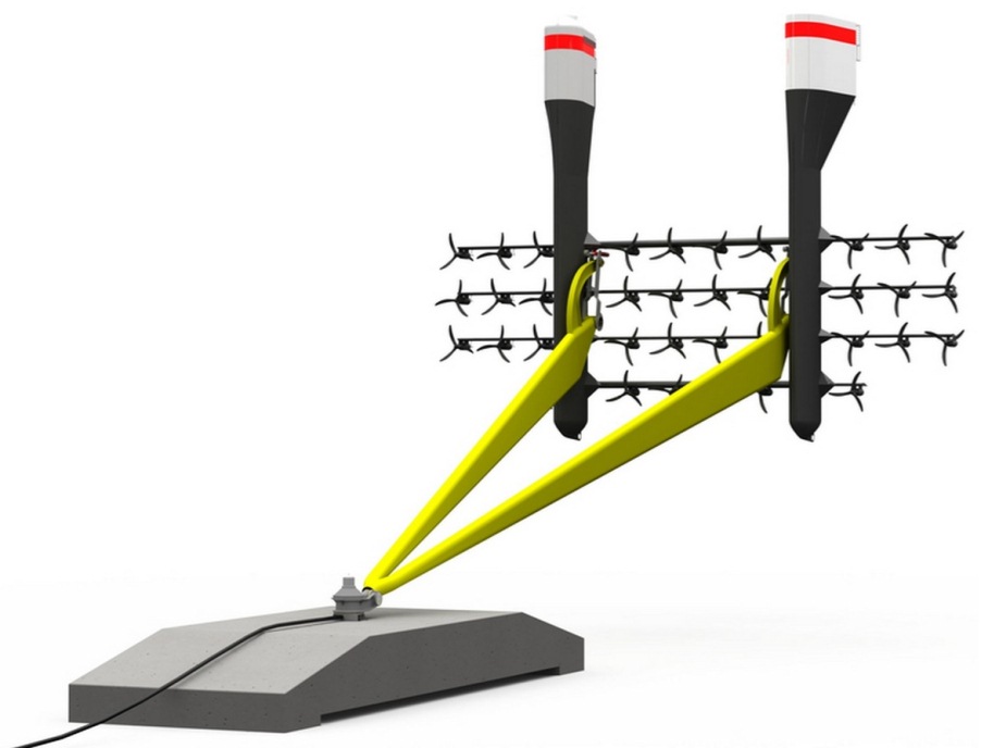 The platform has two spar buoys that provide buoyancy and house both electrical and mechanical equipment for the installation. The platform is attached to a gravity base with a universal joint, allowing the array to align to the direction of the flow.