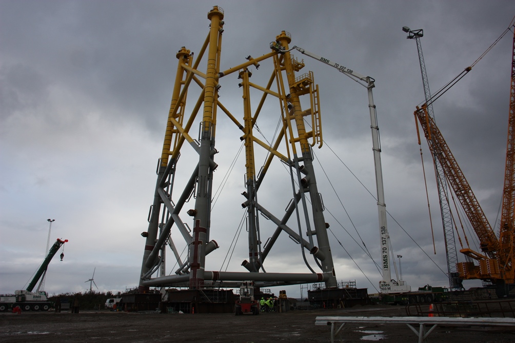 At Bladt’s quay in Aalborg, the 96 metres tall crane easily upended the two sides for the jacket each weighing 525 tonnes. Once both sides were in upright position, they were joined together with remaining bracings and the cellar deck. During the next weeks, all the joints will be welded together.