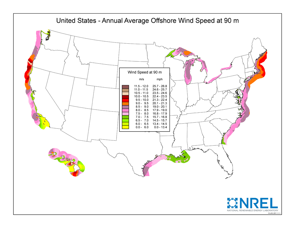 The U.S. has more than 4,000 gigawatts (GW) of offshore wind potential in state and federal waters along its coasts, including the Great Lakes, according to data on technical resource potential published on DoE’s website. Even though all of this potential will not be developed, the magnitude represents a substantial opportunity to generate electricity near coastal high-density population centers, DoE said.