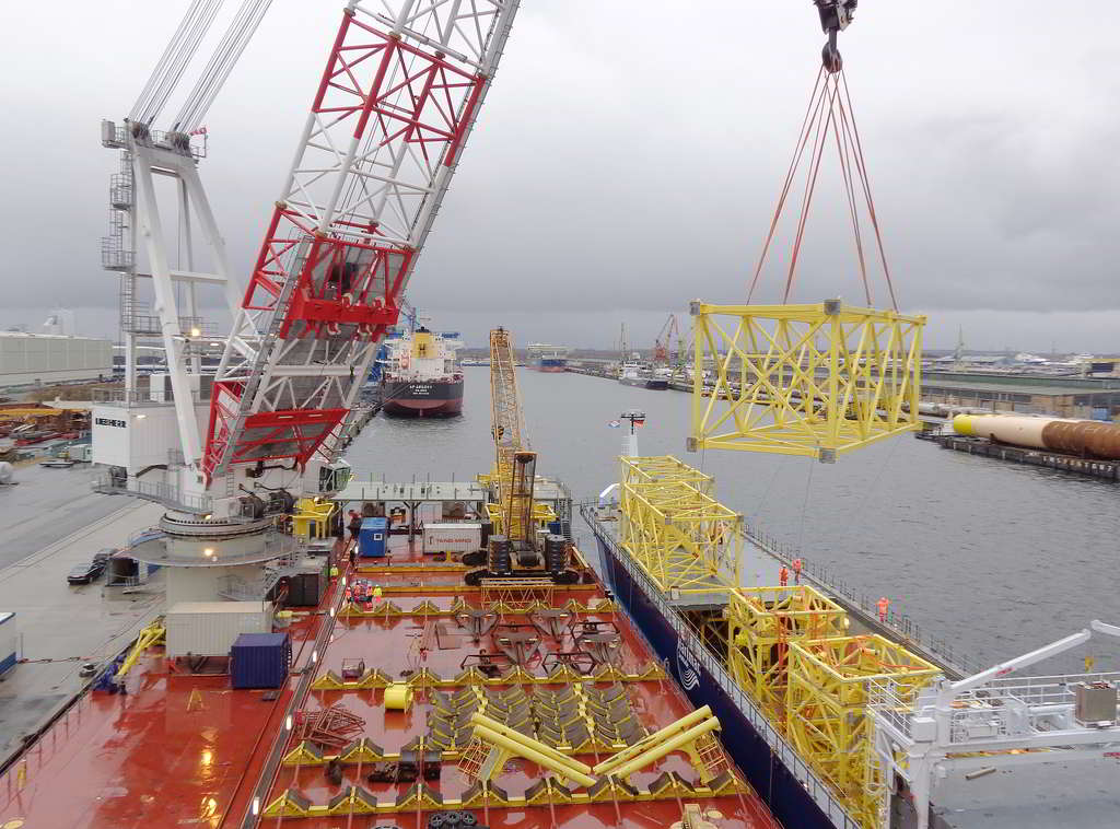 Liebherr’s offshore crane division installed a board offshore crane, type BOS 35000, on the Giant 7 heavy lift barge, which installed the first foundations at the Wikinger offshore wind farm at the end of the last month.
