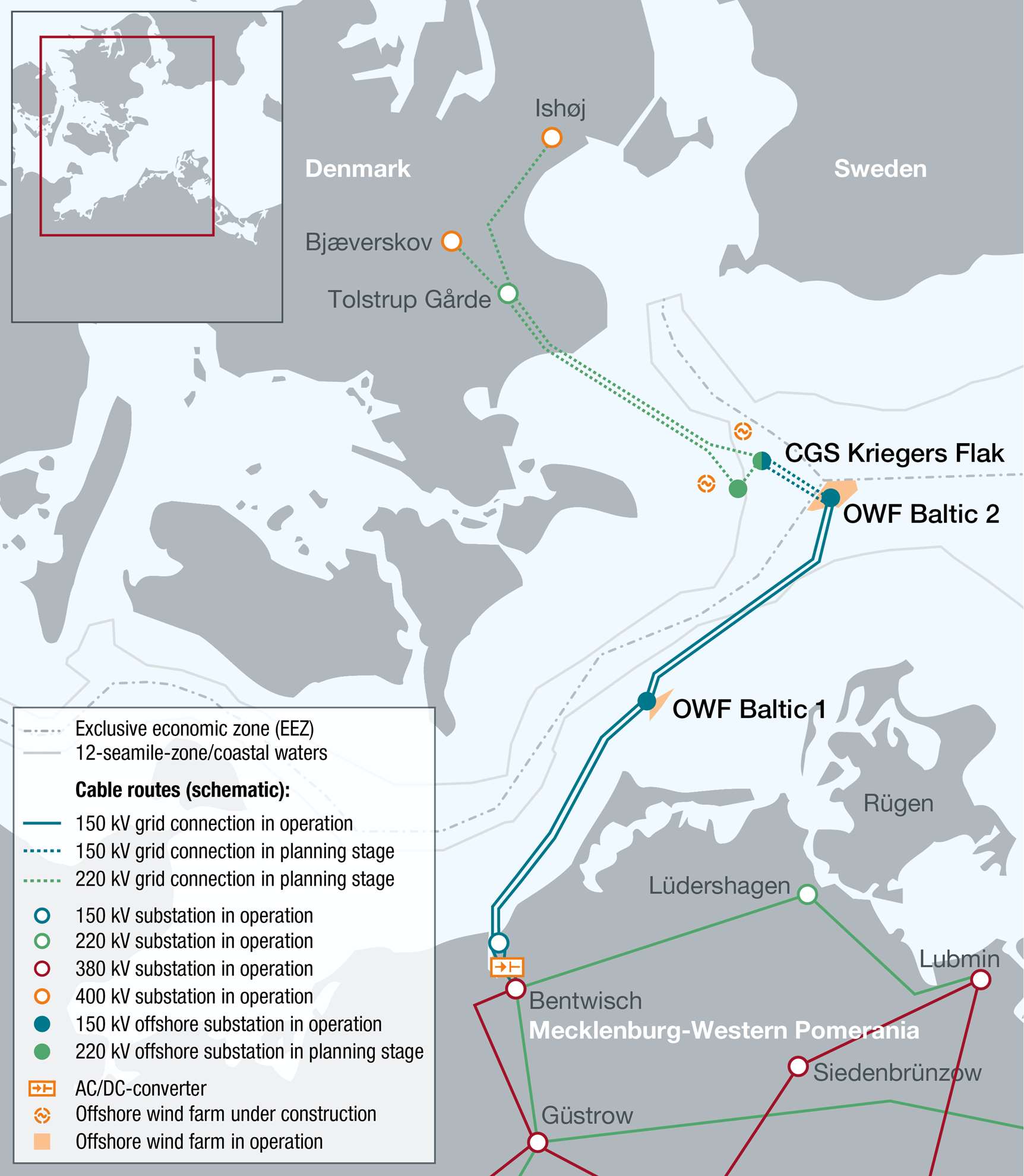 The two transmission system operators are planning a HVAC cable between offshore substations located at the two offshore wind farms, the 600MW Kriegers Flak in Danish waters,  and the 288MW Baltic 2 in German waters of the Baltic Sea. The planned cable route is approximately 25 kilometres long.