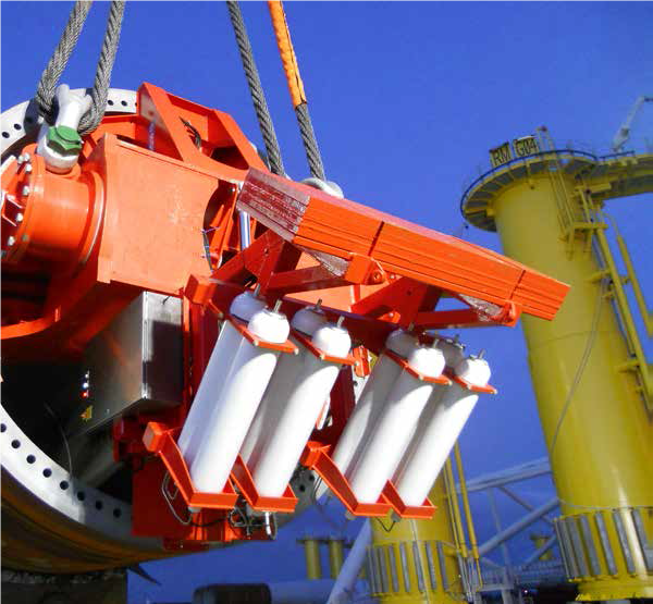 He continues: “The remote controlled hook-up and release system, a self-contained system with rechargeable hydraulic and electric supplies, engages directly with the foundation pile flanges. The recharging is carried out at a deck-mounted docking station, avoiding the need for additional umbilical connections or power lines during lifting operations. The tools are compatible with 855 ton, five metre diameter piles. Remember, these are not small pieces of equipment and handling them offshore, let alone upending them from zero to 90 degrees, is one of the riskiest operations during wind farm construction. The tool is incredibly robust, yet also lightweight enough to ensure easy integration with existing craneage. Some very ingenious design work has gone into the steel structure and hydraulics. It also goes without saying that the control system needed to be simple to use but also be completely fail safe.”