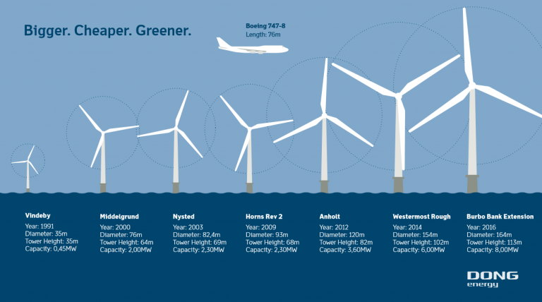 The next breakthrough came in 2015, when DONG built the UK offshore wind farm Westermost Rough with 6MW wind turbines.