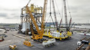 The first jacket foundations built by Bladt for the Wikinger offshore wind project left the company’s facilities at Lindø Industripark on a barge in mid-July.