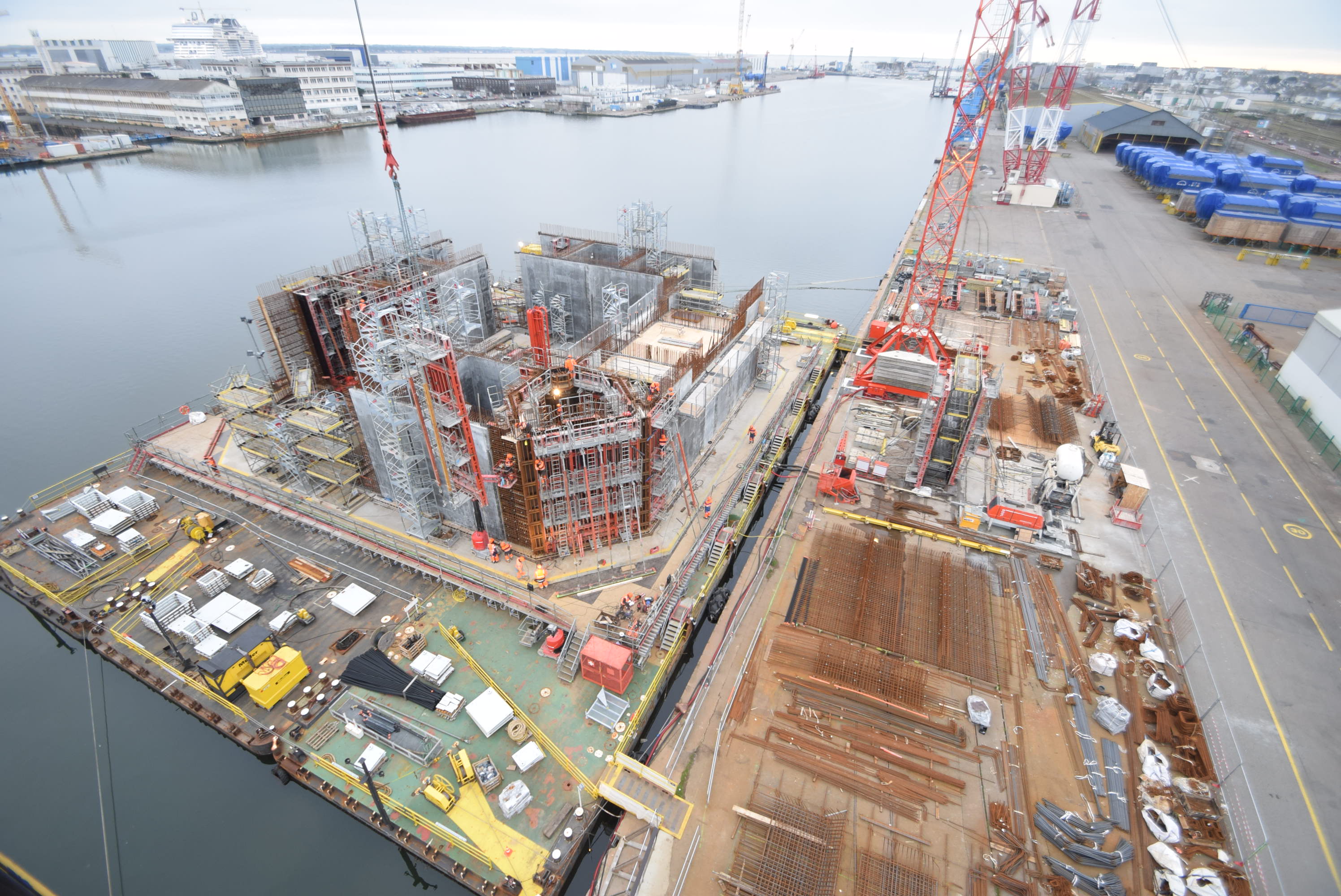 The floating foundation is currently being constructed on a barge moored at Quai des Charbonniers.