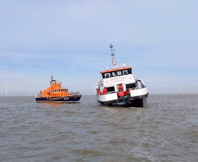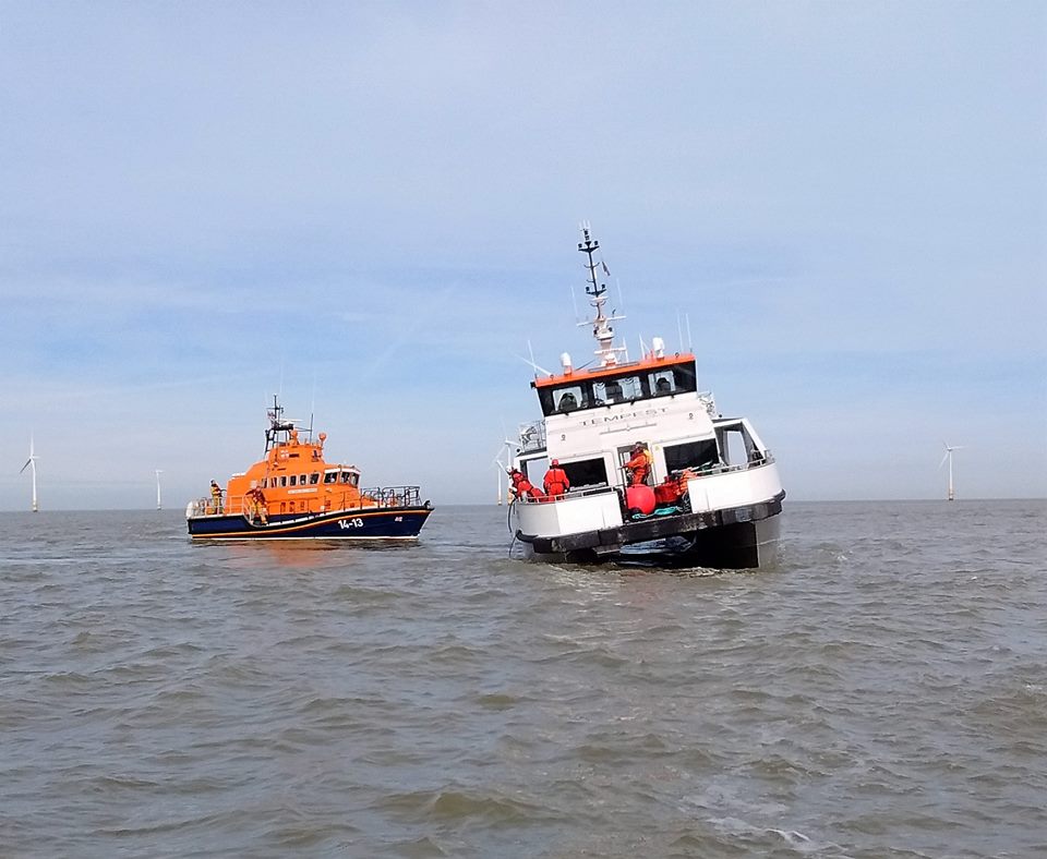 RNLI crews from Whitstable and Sheerness were called around 9.50am on 30 March to assist the Tempest crew transfer vessel (CTV), which had struck an unknown underwater object and was taking in water at the Kentish Flats offshore wind farm area.