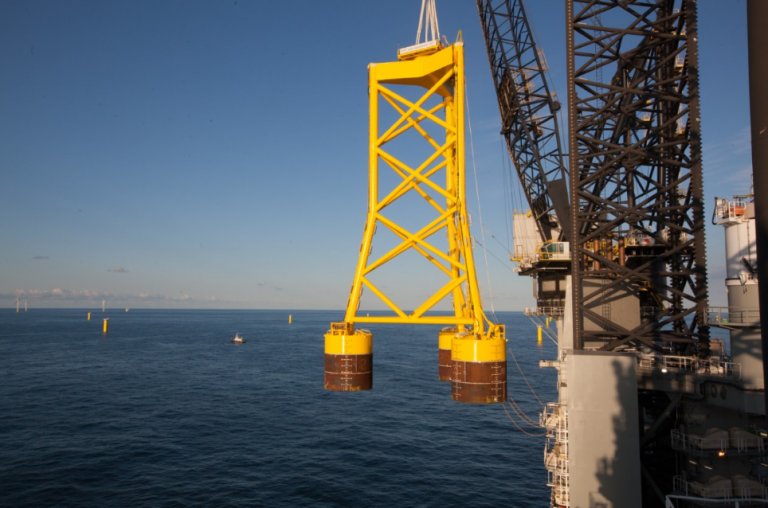 The 56 turbine wind farm will use two types of steel foundations, suction bucket jackets and monopiles. The suction bucket design consists of three legs welded together in a jacket structure, standing on top of three suction buckets anchoring the foundation to the seabed.