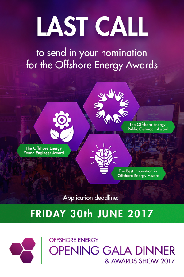 Individuals and companies working in the offshore energy industry have until Friday, 30 June, to send their nominations for this year’s Offshore Energy Awards which will be presented during the Offshore Energy Exhibition & Conference 2017 (OEEC) in Amsterdam.